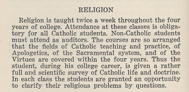 Text titled 'RELIGION' describing a college religious education program with mandatory attendance for Catholic students and optional auditing for non-Catholic students.