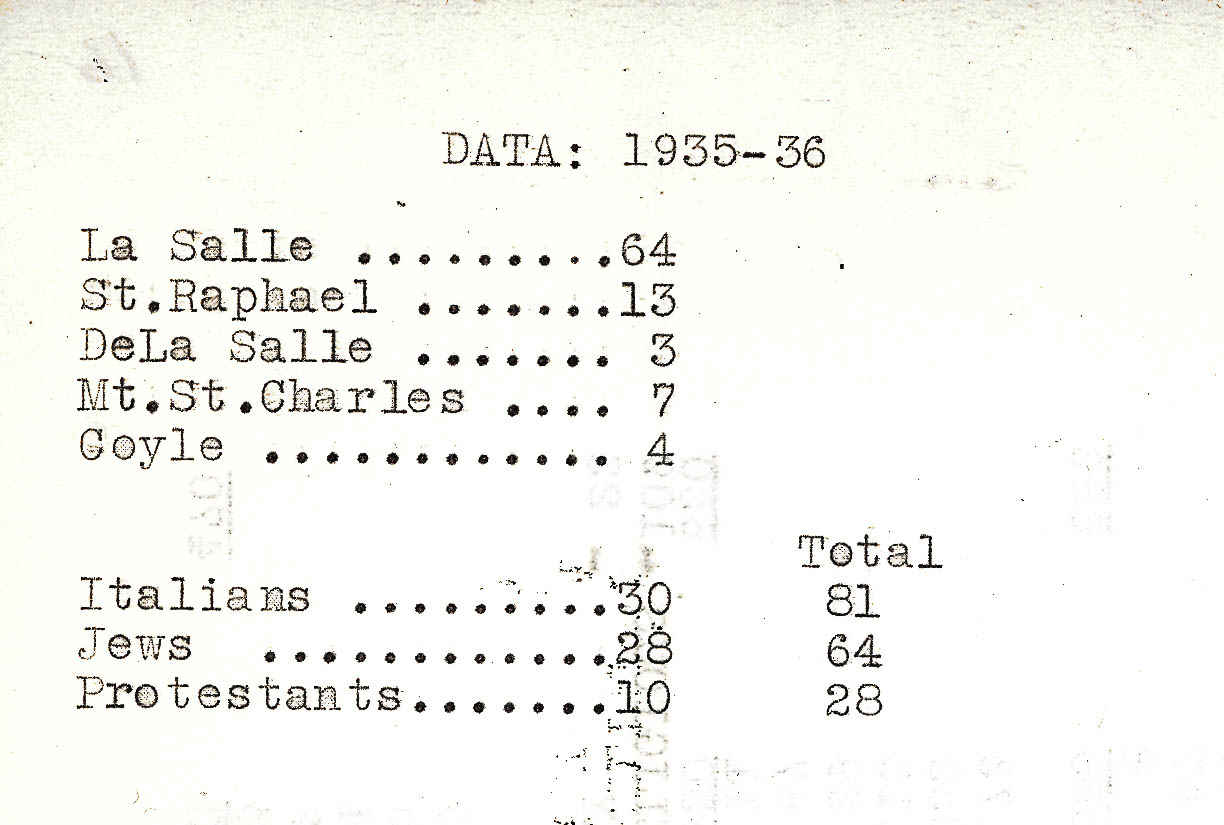 Typewritten document titled 'DATA: 1935-36' listing numerical data by school and ethnic or religious categories, including La Salle, St. Raphael, Italians, Jews, and Protestants.