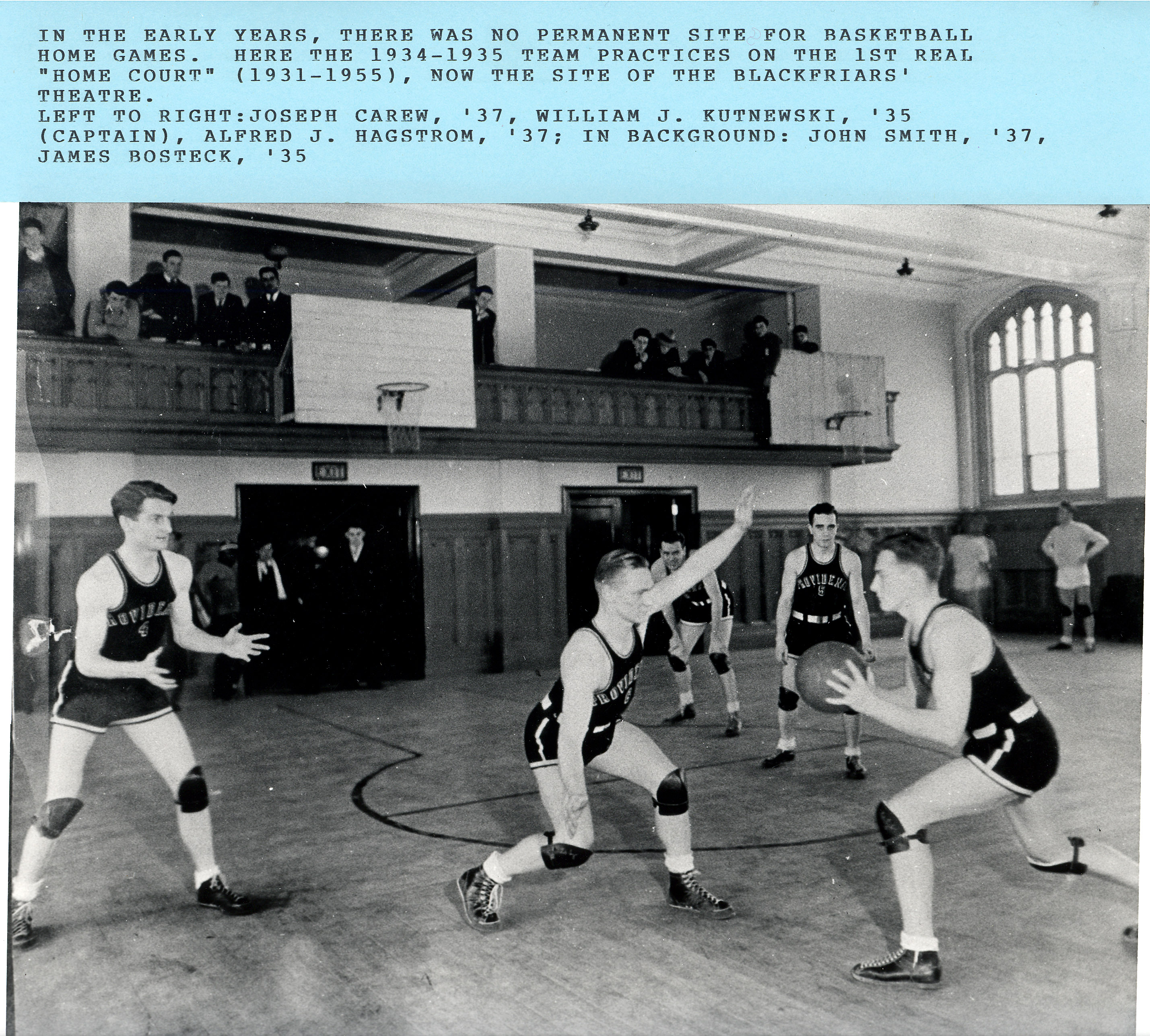 The 1934–1935 basketball team practicing in a gym with wooden floors, and spectators on an upper balcony.