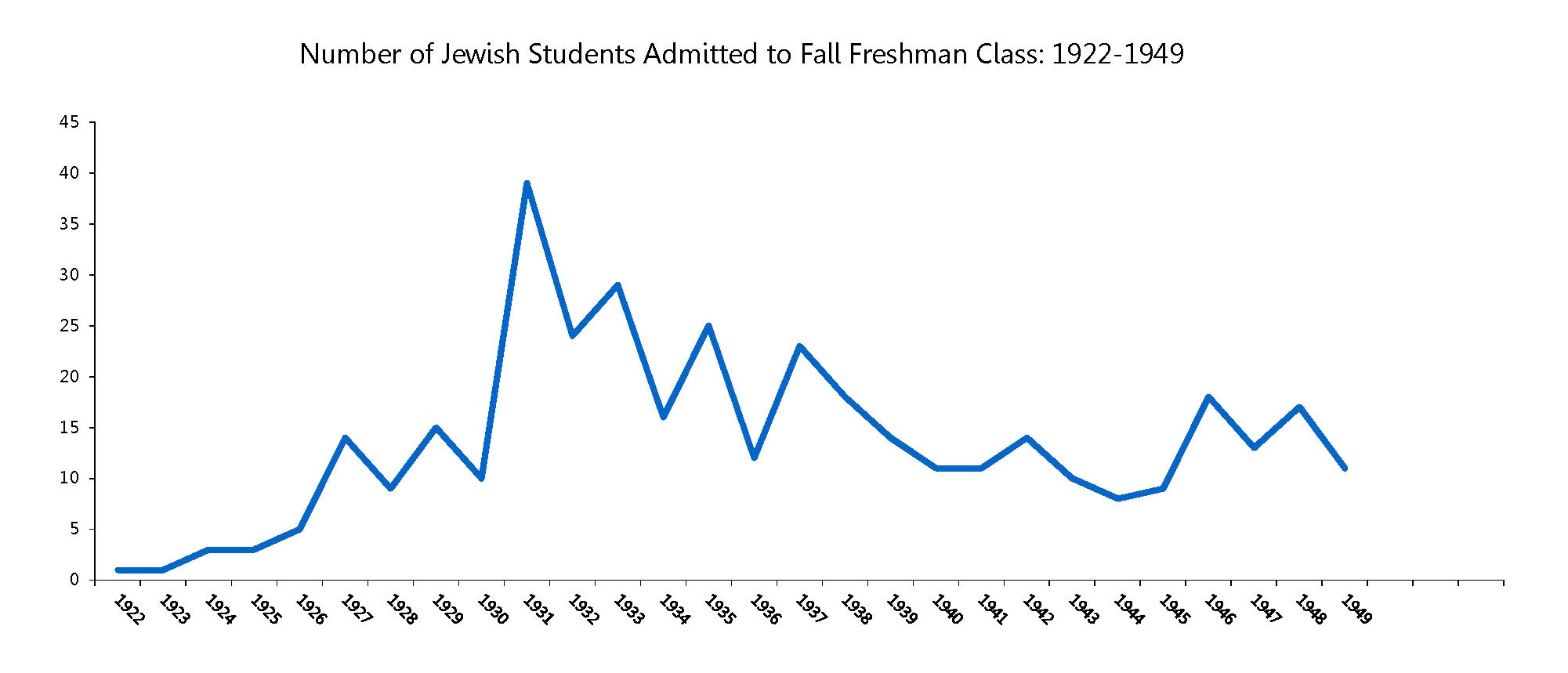 A line graph titled "Number of Jewish Students Admitted to Fall Freshman Class: 1922–1949," showing yearly admissions with a peak around 1930 and a gradual decline toward 1949.